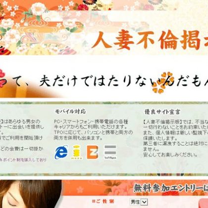 人妻・熟女系 妻会 完全に人妻のためだけに作られた人妻・熟女系出会いサイトが「妻会」だ。 なんとこのサイトでは既婚女性以外は登録を断るという徹底ぶりで、当然のことながら登録してる女性の全員が既婚者。女…〔続きを読む〕